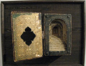 She’s also clearly fond of layers and doors and tunnels. One of my favourites pieces was “Tunnel book,” constructed of an old German Bible. Hard to see on the photo below, but it’s got tiny doors at the very back. As if to suggest that beyond the front door and the steps (made of pages of words) up and in, deeper and deeper, there’s even more, mystery and depth and surprise.