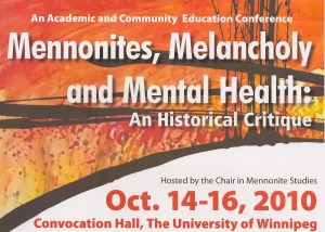 The past days have been unusually stimulating for me. The main reason is the annual conference of the Chair in Mennonite Studies at the University of Winnipeg, this year on “Mennonites, Melancholy and Mental Health.” I attended much of it, from Thursday evening to this afternoon, hearing papers on a whole variety of topics connected to mental health – from the history of attitudes, to the history of institutions (like Bethania in Russia, Bethesda in Ontario, Mennonite Youth Farm in Saskatchewan), to personal and family histories, and a lot in between.