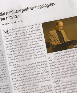 A news article in the latest MB Herald, with the headline “MB seminary professor apologizes for remarks,” reveals that B.C. conference minister Steve Berg sent an email to the MB seminary (MBBS) board in November expressing “his concerns” that “Mark Baker states that penal substitutionary atonement is unbiblical.” The email also said, “In what is already a very challenging time for MBBS, we are concerned that there is a disconnect underway between BCMB churches and MBBS, and the atonement debate is accelerating the process.”